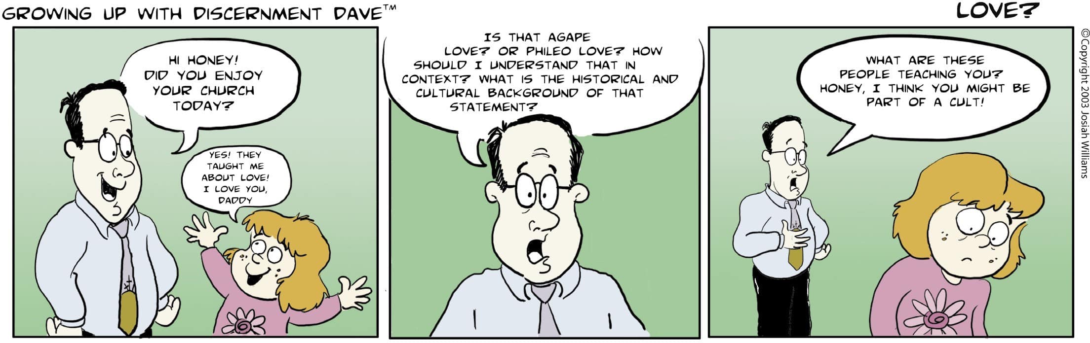 For example, we based the “Discernment Dave”TM cartoon in this publication on a real-life event. Someone who didn’t like something our ministry lives and preaches immediately made an inquiry to a large, well-known discernment club. At the mere mention of the words of Jesus in Luke 16:13 the discernment group sounded alarms. A message was sent out that assumed the worst and looked for evil. They broke the law of love Jesus commanded us to keep and in their hearts thought evil of everyone but themselves, (Zechariah 7:10. Romans 13:8).