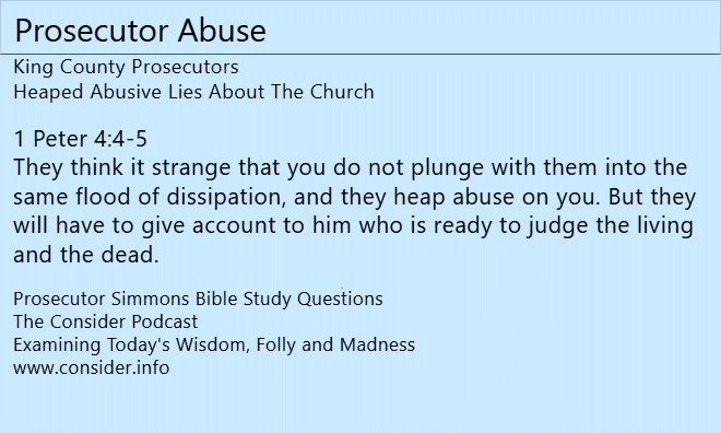 Washington State prosecutors brought a Christian church to trial during the same period that Attorney General Bob Ferguson was targeting a Christian grandmother for refusing to arrange flowers for a same-sex wedding. Prosecutor Jason Simmons and Judge Lori K. Smith utilized absurd corrupt legal tactics not only to undermine religious freedoms but also to obscure Detective Grant McCall’s hate crime. This intense 28-day trial persecuted through prosecution the truth and love of a holy God associated with Sound Doctrine Church and Timothy Williams. These podcasts aim to address those concerns, at least for those willing to listen. From planting lies to destroying evidence every, and all, corruptions were employed Prosecutor Jason Simmons and Judge Lori K. Smith. Click here for a Consice Recap.