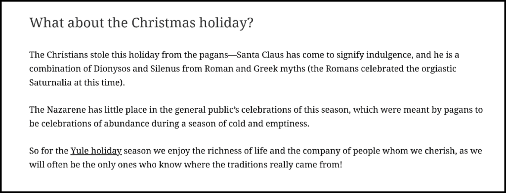 What about the Christmas holiday? The Christians stole this holiday from the pagans—Santa Claus has come to signify indulgence, and he is a combination of Dionysos and Silenus from Roman and Greek myths (the Romans celebrated the orgiastic Saturnalia at this time).