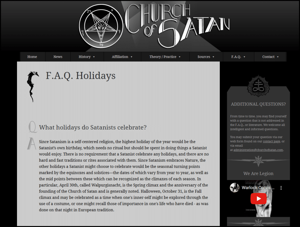 F.A.Q. Holidays What holidays do Satanists celebrate? Since Satanism is a self-centered religion, the highest holiday of the year would be the Satanist’s own birthday, which needs no ritual but should be spent in doing things a Satanist would enjoy. There is no requirement that a Satanist celebrate any holidays, and there are no hard and fast traditions or rites associated with them. Since Satanism embraces Nature, the other holidays a Satanist might choose to celebrate would be the seasonal turning points marked by the equinoxes and solstices—the dates of which vary from year to year, as well as the mid points between these which can be recognized as the climaxes of each season. In particular, April 30th, called Walpurgisnacht, is the Spring climax and the anniversary of the founding of the Church of Satan and is generally noted. Halloween, October 31, is the Fall climax and may be celebrated as a time when one’s inner-self might be explored through the use of a costume, or one might recall those of importance in one’s life who have died – as was done on that night in European tradition. – F.A.Q. Church of Satan