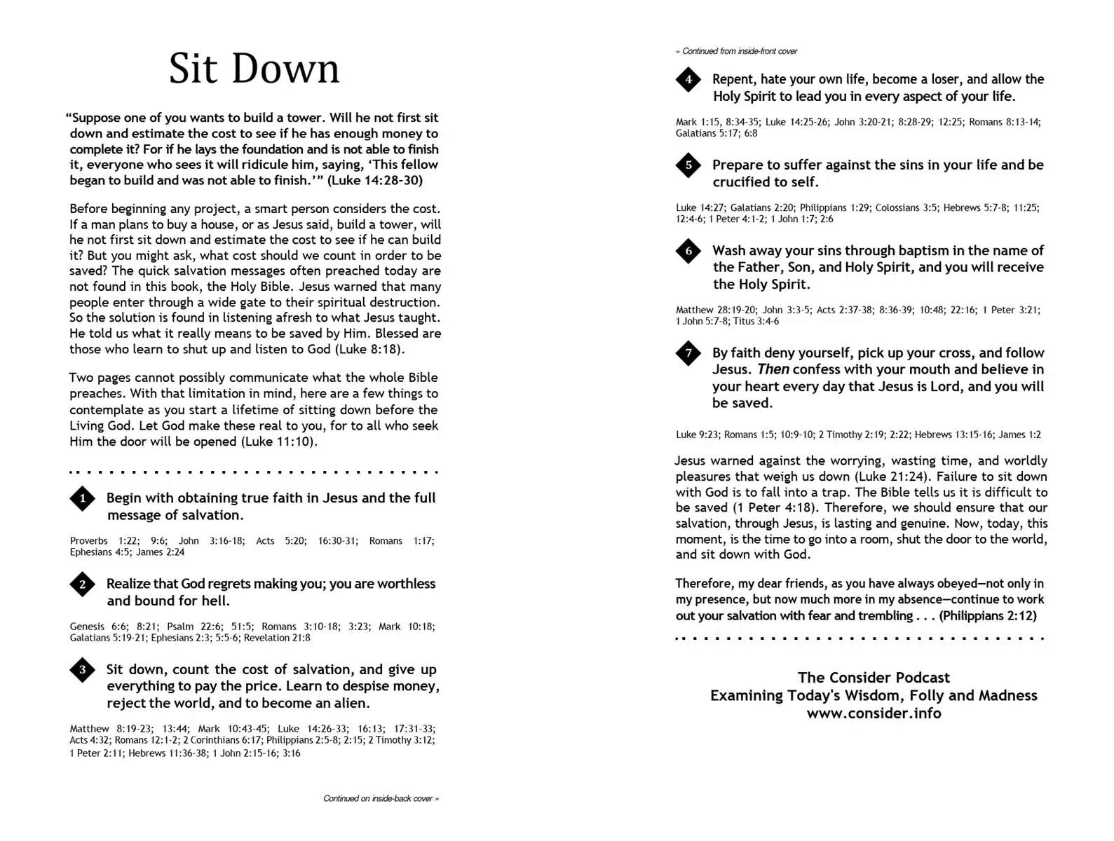 Jesus demands that everyone who looks to Him for salvation stop their activities, listen to Him, and count the cost of what it means to wear the mark of a Christian. Even the thief on the cross next to Jesus had to be nailed down and forced to look at Salvation before he was ready to accept God’s mercy. Unfortunately, many refuse to sit down with Jesus until God places them in painful positions. And even then, most refuse to sit down with the true Gospel in order to be saved from hell.