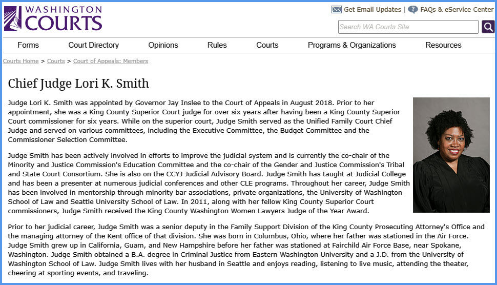 - Judge Lori k. Smith “has been actively involved in efforts to improve the judicial system and is currently the co-chair of the Minority and Justice Commission’s Education Committee and the co-chair of the Gender and Justice Commission’s Tribal and State Court Consortium. She is also on the CCYJ Judicial Advisory Board. Judge Smith has taught at Judicial College and has been a presenter at numerous judicial conferences and other CLE programs. Throughout her career, Judge Smith has been involved in mentorship through minority bar associations, private organizations, the University of Washington School of Law and Seattle University School of Law. In 2011, along with her fellow King County Superior Court commissioners, Judge Smith received the King County Washington Women Lawyers Judge of the Year Award.” Judge Lori K. Smith