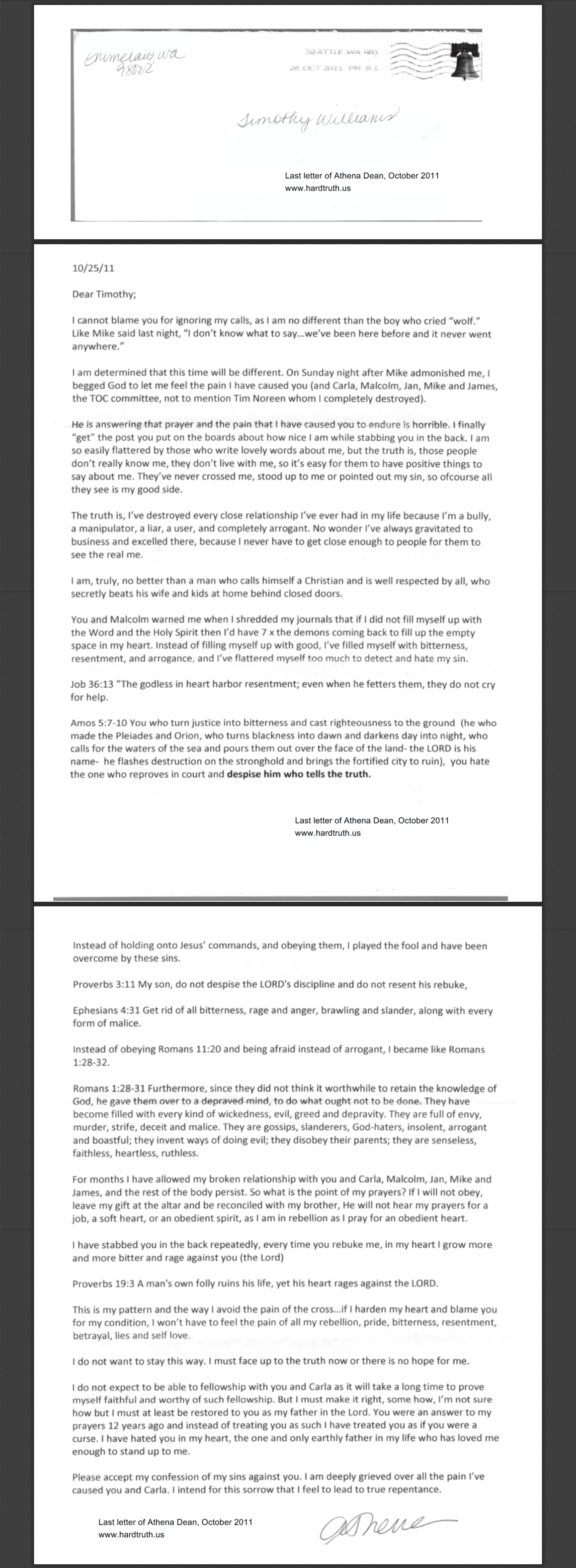 Text Last Letter of Athena Dean Holtz Addressed to Timothy Williams 4th Marriage to Pastor Ron Hotlz The Summit Church Redemption Press, Enumclaw Wa. October 25, 2011