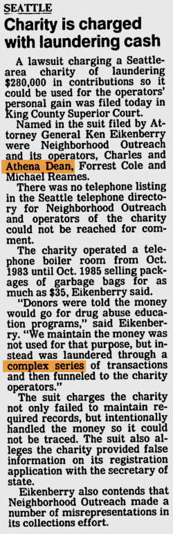 There was no telephone listing in the Seattle telephone directory for Neighborhood Outreach and operators of the charity could not be reached for comment.
